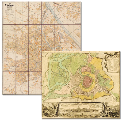 Plány Vídně a Paříže s významnými stavbami (19. století)