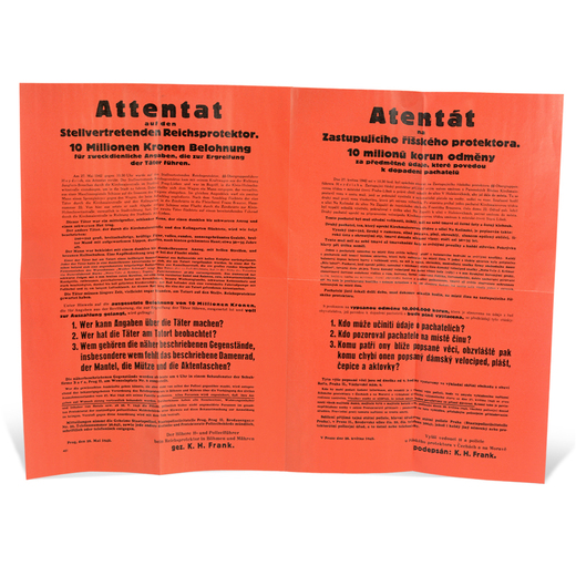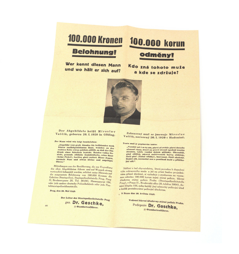 Vyhláška s odměnou za dopadení parašutisty Valčíka